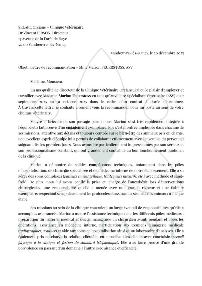 Engagée depuis plusieurs années dans le domaine animalier, j’adresse cette lettre afin de partager mon parcours et ma démarche professionnelle, dans l’espoir de pouvoir mettre mes compétences au service d’une structure sensible aux enjeux du bien-être et de la protection animale.