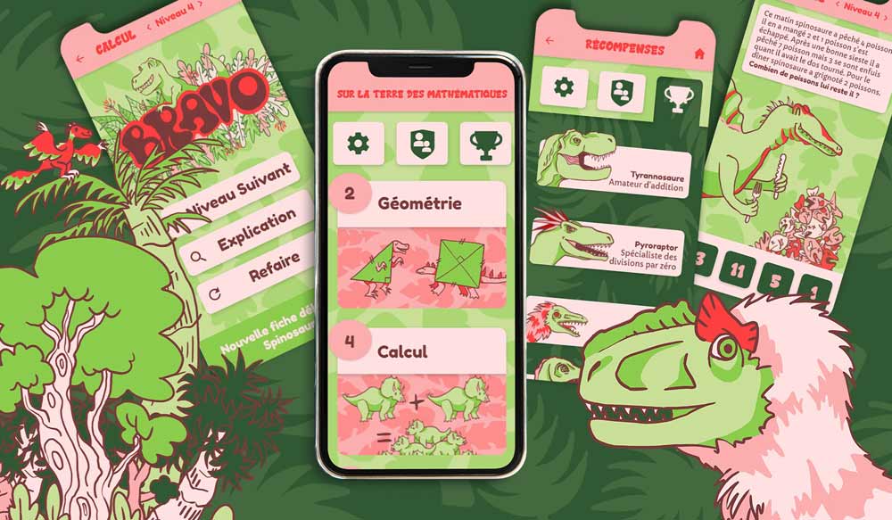 Par exemple j’ai imaginé l’application Sur la terre des Mathématiques. Ce jeu éducatif utilise le prétexte des dinosaures pour enseigner les mathématiques aux enfants. Tout ce que j’ai mis en page sur ce projet a été conçu pour être attrayant, pour rappeler l’esthétique des jeux mobiles, afin que les utilisateurs n’aient pas l’impression de faire un cours de math, mais s’amusent ! Comme je donne des cours d’art à des enfants, l’éducation ludique me tient à cœur dans mon approche de la diffusion du savoir.