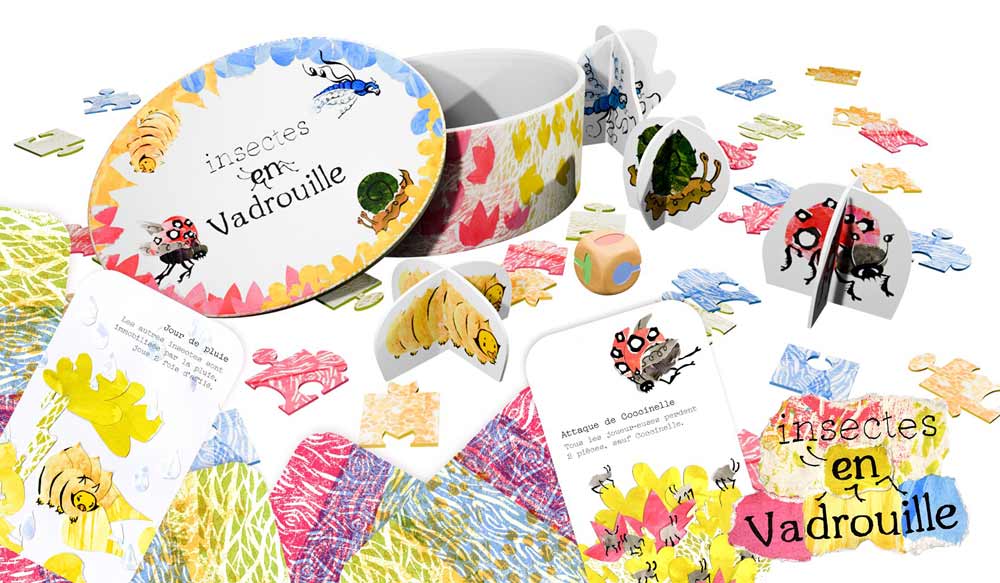 Et pour continuer dans l’univers ludique, j’ai aussi imaginé un jeu de société, Insectes en Vadrouille. Dans ce jeu familial, chaque joueur incarne un insecte qui doit arriver en haut de son arbre puzzle avant les autres. Pour la direction artistique, j’ai commencé par réaliser les illustrations, puis je les ai utilisées sur les différents supports du jeu : la boite, les pions, les cartes, … J’ai aussi réalisé une petite vidéo promotionnelle en stop-motion que vous pouvez voir ici :