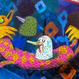 Enfin, place aux chimères de Nelson Apadola et d’Alëxone Dizac, deux Français aux univers graphiques très différents mais complémentaires. Le premier travaille avec un tracé quasi automatique et de la peinture directement projetée au tube, ce qui confère une intensité particulière à ses personnages mi-hommes, mi-loups. Le second investit le dernier espace de la galerie à travers des sculptures murales mises en abyme, du sol au plafond. Tenus en laisse par un géant burlesque, des chiens fantasques, peints sur bois, admirent les vrais tableaux de l’artiste, représentant eux-mêmes des bêtes à poil. Les chiens et leurs maîtres visitant l’exposition pourront d’ailleurs se mêler à ces personnages en bois et s’immortaliser… comme des éléments à part entière de cette saynète surréaliste !