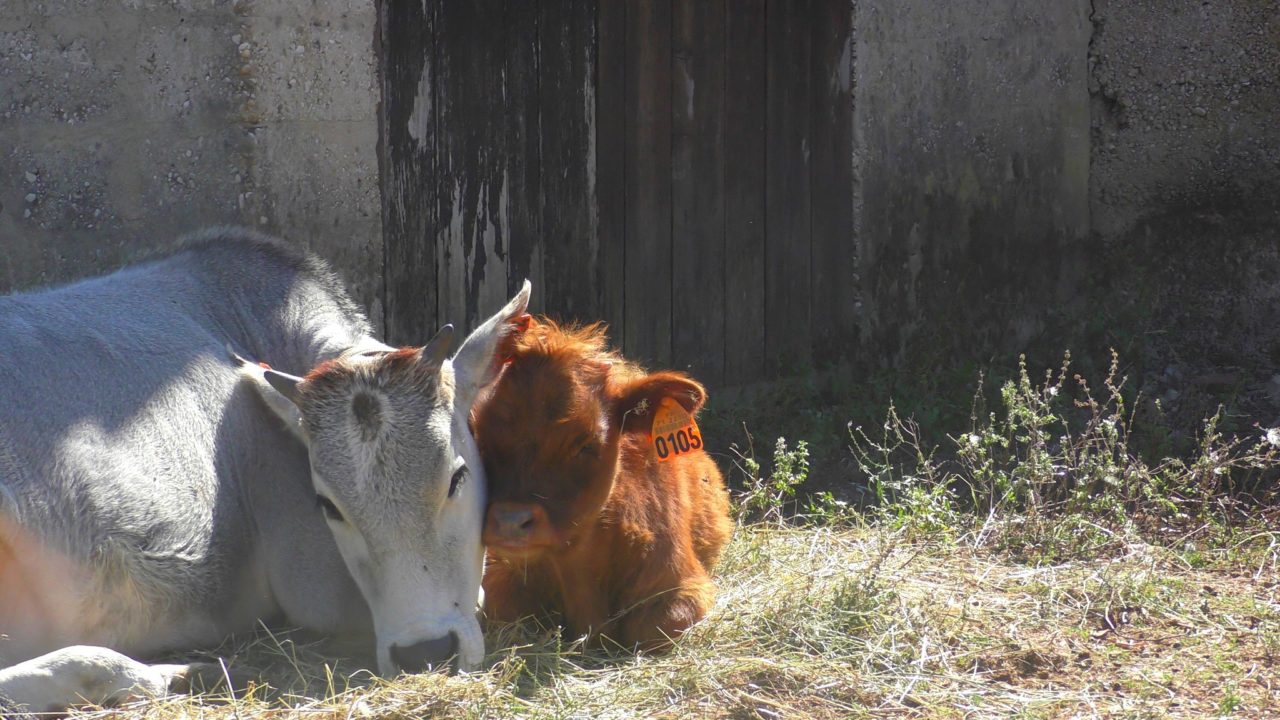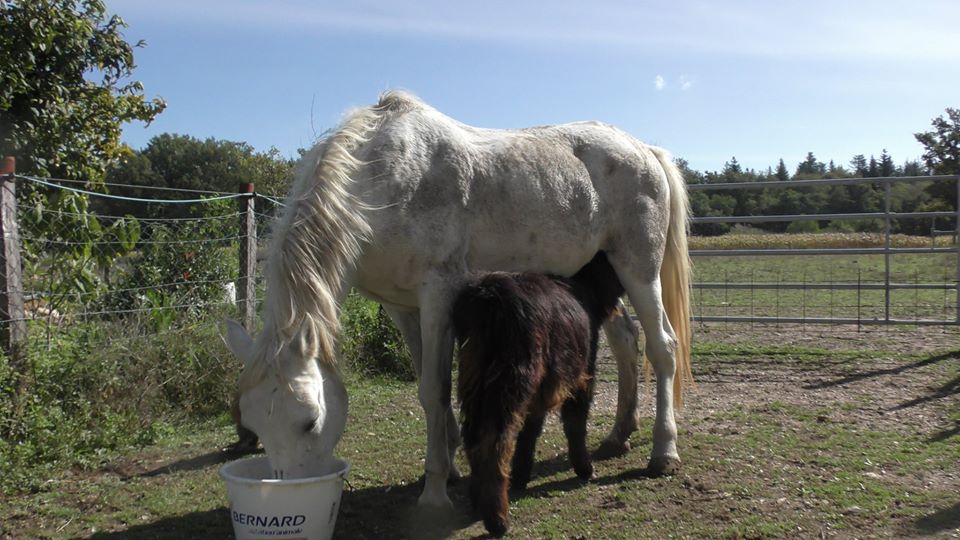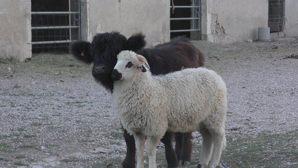 Il est fréquent de voir des histoires d’amour ou d’amitié d’une grande force. Une jument arrivée dans un état très grave (âgée de 25 ans, atteinte de dénutrition extrême et d’une piroplasmose, avec une fracture d’un postérieur jamais soignée, malvoyante) a adopté une petite vache lourdement handicapée (aveugle, épileptique, avec une compression de la moelle épinière) âgée d’un mois. Au bout d’une dizaine de jours la jument, Yoko, a fait du lait et a allaité la velle, Poésie, durant 8 mois… Une autre jument, Shambhala, arrivée au refuge suite aux problèmes de santé de sa propriétaire, a adopté une jeune femelle zébu qui était destinée à l’abattoir, Eowyn. Puis cette famille s’est agrandie avec l’adoption par les juments d’un agneau qui risquait d’être égorgé pour des fêtes rituelles et d’un veau victime de négligence, dénutri avec des problèmes osseux et musculaires.